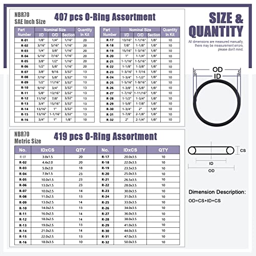 🥇 Swpeet 834Pcs SAE and Metric Universal O-Ring Washer with Long and Short Pick and Hook Assortment Kit, Nitrile Rubber O Ring SAE Metric Rubber O-Ring Washer for Faucet Repair 🥇 WHY CHOOSE US? 💯 1, SAE and Metric Sizes, Lots Of O-Rngs, Various Sizes, Substantial Quality Product 💥 O-Ring Kits in 64 Popular Sizes to Meet Nearly All Your Everyday Needs. Nitrile O-rings are the most widely used O-ring material in life. It has excellent oil resistance, good water tightness, high temperature resistance and wear resistance, and corrosion resistance. 💯 2, Save Your Time and Money 💥 Comes in a very sturdy well marked container. Contents are fresh, not old rotten stored in some warehouse someplace. A tremendous value. last for many years, saving tons of money on replacing equipment that transfers fluids under pressure. Saves tons of time going to a hardware store, trying to find an O-Ring in drawers full of everything mixed up inside most packages already ripped open. 💯 3, 4Pcs Long and Short Pick and Hook Set, Easy TO Use 💥 The soft rubber non-slip handles are brightly colored for easy location in your toolbox or on your workbench. This set is handy for ignition systems, intake valves, rifle bolt faces, seals, fuel valve O-rings, hose end O-rings, and electronics. 🥇 Specifications: 💫 Material: Made of Nitrile rubber. 💫 Colour: Black 💫 407Pcs SAE Rubber O-Ring Washer: SAE standards have 32 sizes from 1/8” I.D. x 1/4” O.D. to 2” I.D. x 2-1/4” O.D. 💫 419Pcs Metric Rubber O-Ring Washer: Metric standard have 32 sizes from 3 mm I.D. to 50 mm I.D. 💫 Pick and Hook: full hook; 45-degree pick; 90-degree pick; straight pick 🥇 Package Included: 💫 407Pcs ------------- SAE O-Rings Assortment Kit 💫 419Pcs ------------- METRIC O-Rings Assortment Kit 💫 8Pcs ----------------- Oil Seal Hooks ( Including 4Pcs Short and Long ) 💥 Intotal 834Pcs