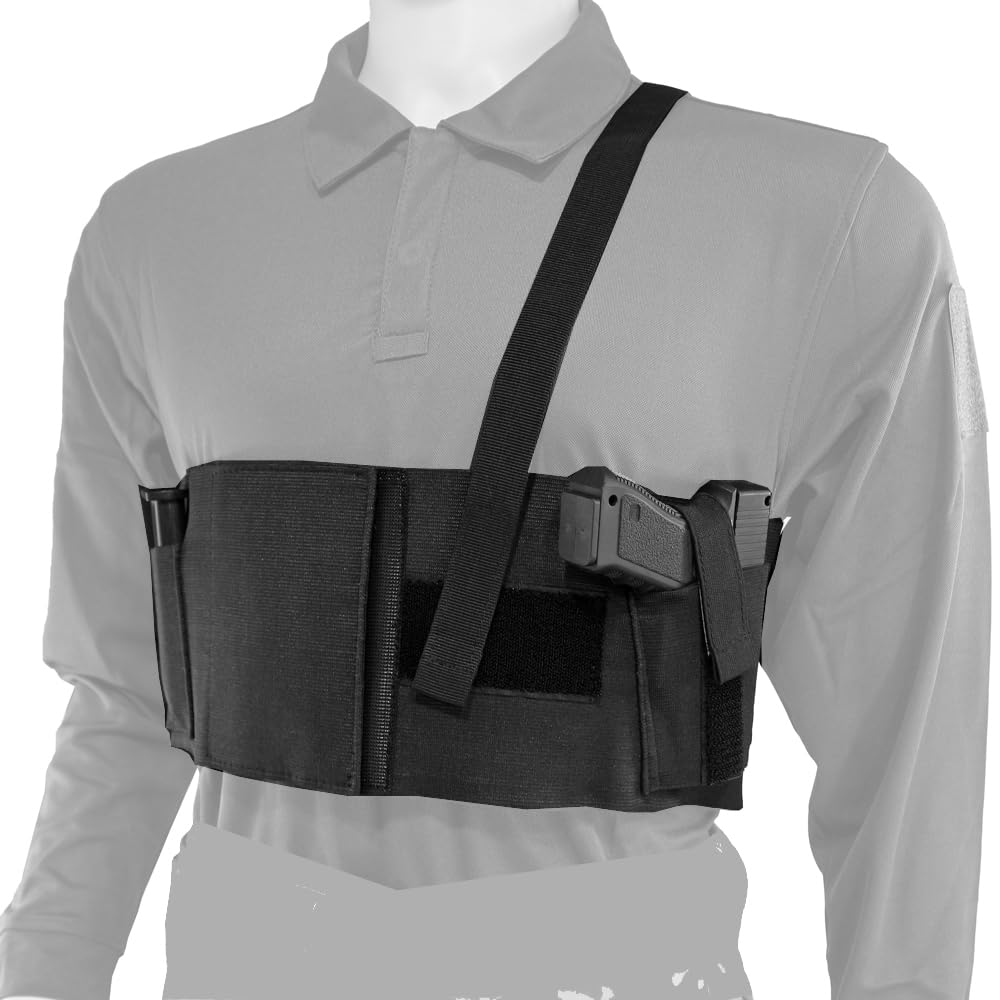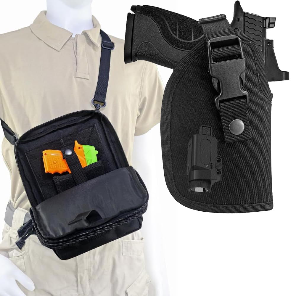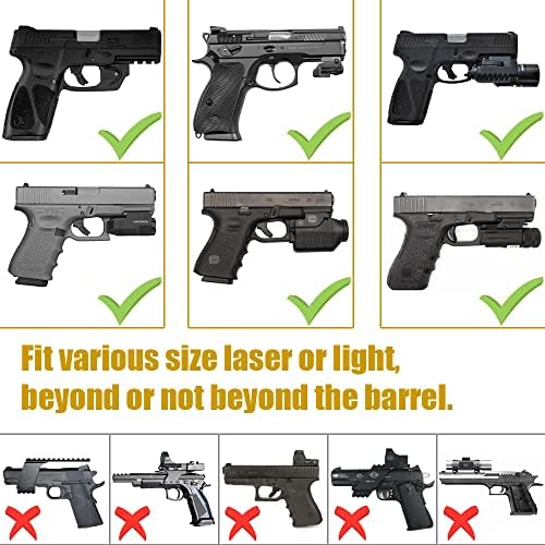 - Diseñado para adaptarse a la mayoría de las pistolas de tamaño mediano y completo con un accesorio de luz o láser debajo del cañón.