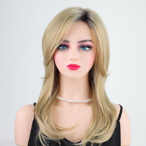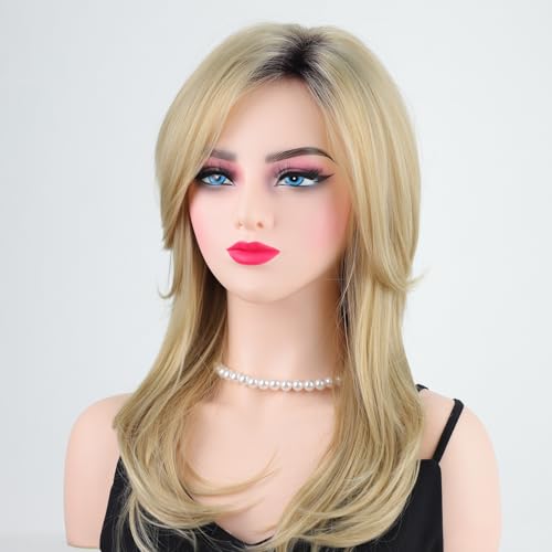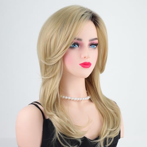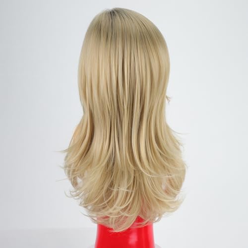 - The long synthetic wig has natural blonde hair with dark roots, as natural as your own hair, you can wear this blonde wig to do anything you want, is fashionable and charming.