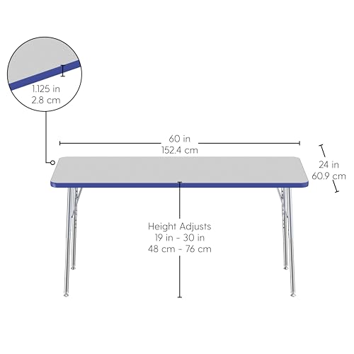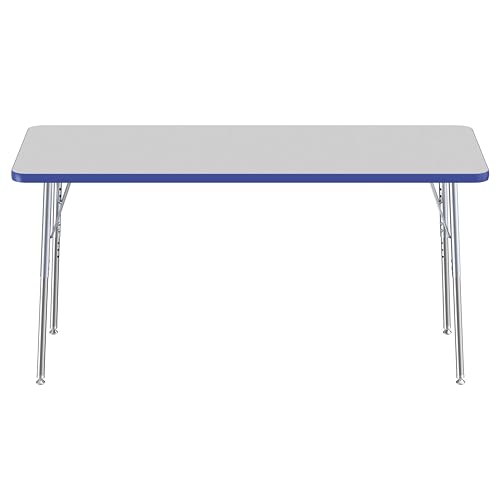 Factory Direct Partners FDP Rectangle Activity School and Office Table (24 x 60 inch), Silver Standard Legs with Swivel Glides, Adjustable Height 19-30 inches - Gray Top and Blue Edge