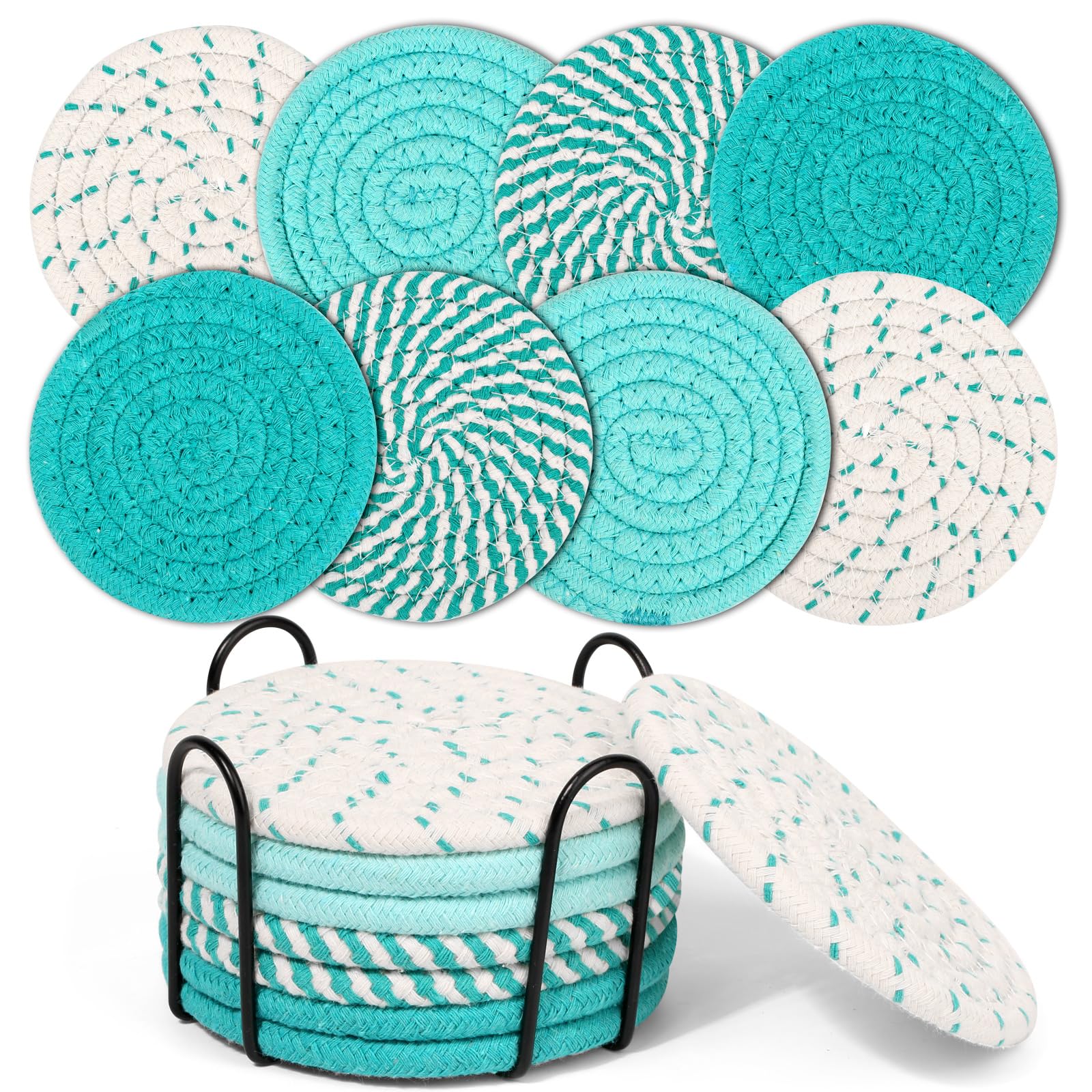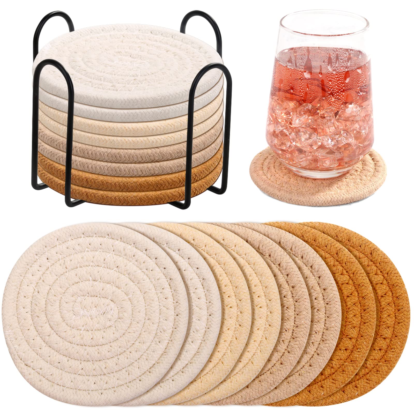 - What You Get: You will get more quantity and more multiple styles coasters from us than any others . You'll get 8pcs round hand-woven cotton coasters (ultra-minimalist style, 4.3") and a 4.3"x3.1" black metal coaster holder.4 colors designs 8pcs in total, which can be used in almost any family scene.