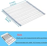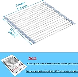 【OVER THE SINK DRYING RACK】: 17.5 x 13.7 inch. Suitable for most kitchen sinks and counter. A good helper for a tidy kitchen and cozy home. Please measure your sink size before purchasing this roll up dish drying rack! 【SPACE SAVING】: The rollable kitchen drying rack is designed with 18 stainless steel tubes, fixed firmly by silicone, which makes it easy to use, lay flat, clean or roll up for storing in cabinet when not in use, saving your counter space. 【MULTI-PURPOSE】: This folding sink dish drying rack not only can be used as a dish drainer for air-drying kitchenware, such as washed bowls, pans, glasses, cups, plates, cookware, cutlery; but also as a vegetable colander for fruit and veggies; or as a non-slip trivet mat for hot pots or bakeware on countertop. 【SPACE SAVING】: The rollable kitchen drying rack is designed with 18 stainless steel tubes, fixed firmly by silicone, which makes it easy to use, lay flat, clean or roll up for storing in cabinet when not in use, saving your counter space. 【FOOD SAFE AND HEAT RESISTANT】: The dish rack over the sink with food safe grade silicone coated is heat resistant up to 400°F (204°C), BPA-free, dishwasher safe. As a perfect trivet for cooling down hot pans from oven or stovetop, or thawing frozen articles from refrigerator. One of the great new home essential items for your kitchen.