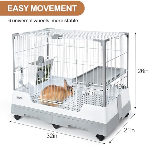 OIIBO Deluxe Rabbit Cage, 32" × 21" × 26" Large Space Bunny Cage Foldable Small Animal Cage with Pull Out Tray and Caster Platform, Professional Household Anti-Spray Urine Rabbit Cage Hutch Indoor
