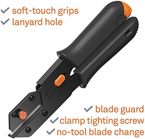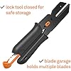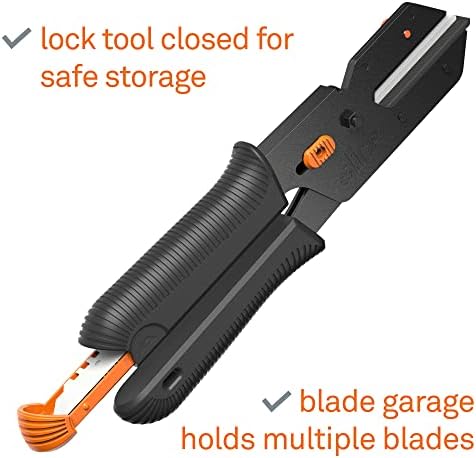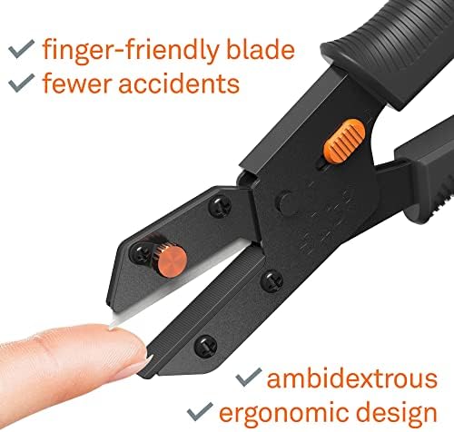 - Finger-friendly blade is the only safety blade on the market|Durable steel handle with soft-touch comfort grips|Blade guard and tool lock provide safe storage|Convenient in-built storage for multiple spare blades|Suitable for left- and right-handed uses|Slice blades last 11.2x longer than traditional blades