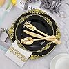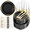 Hioasis 525pcs Black and Gold Plastic Plates - Elegant Diposable Dinnerware Set Suitable for 75 Guests Include 10.25" Dinner & 7.5" Dessert Plates, Pre Rolled Silverware Set, Cups for Party & Wedding
