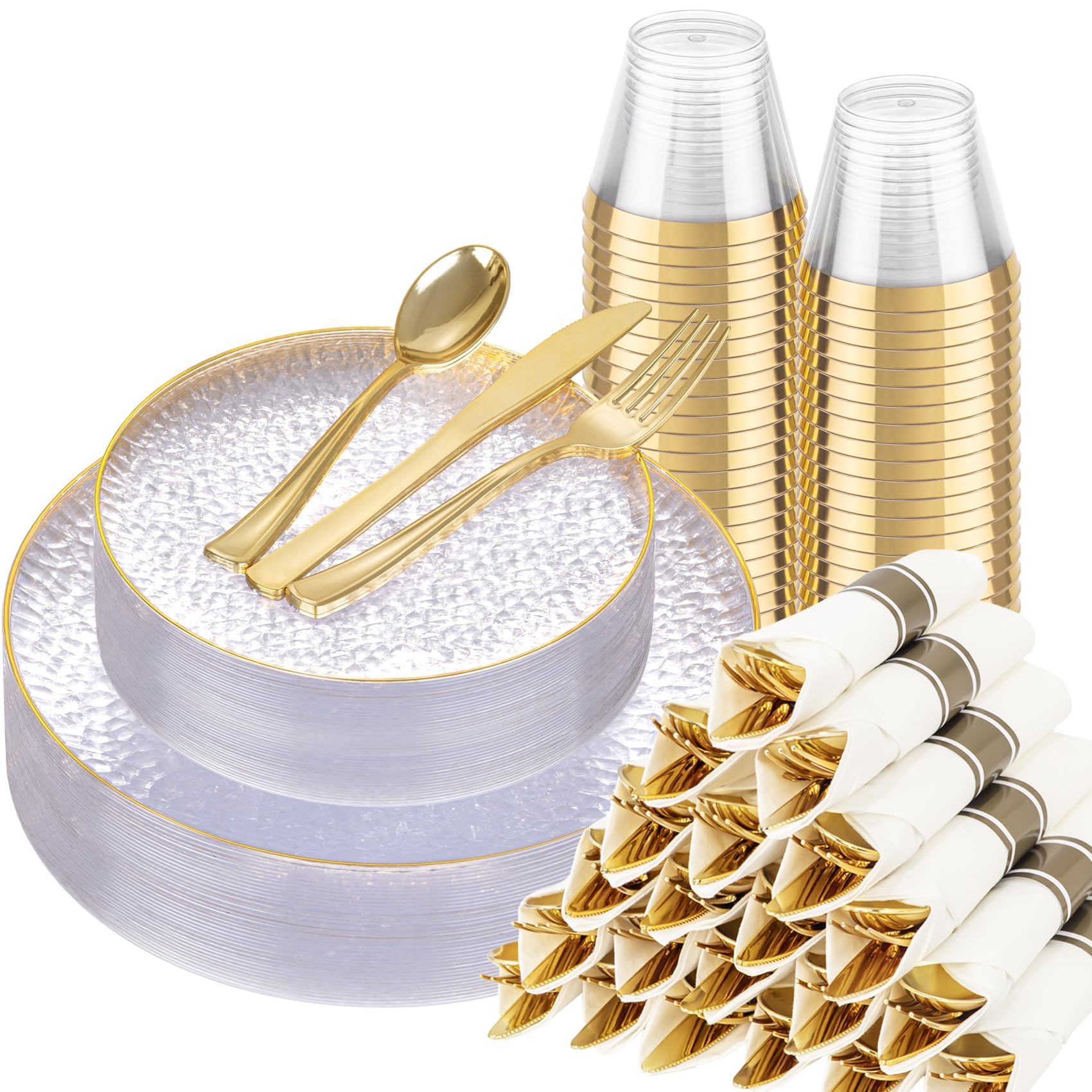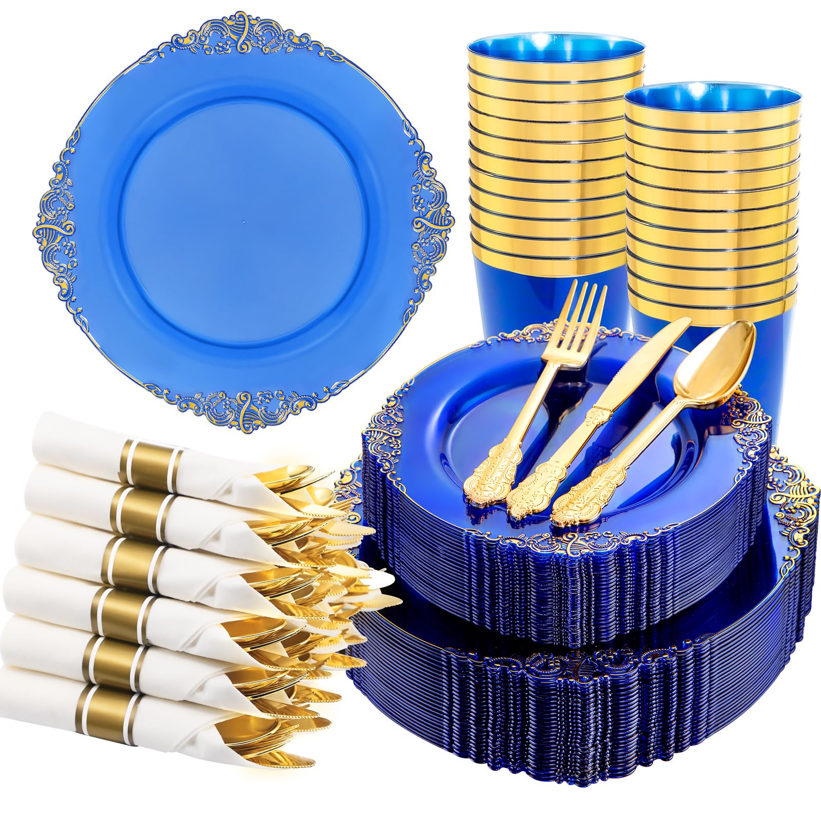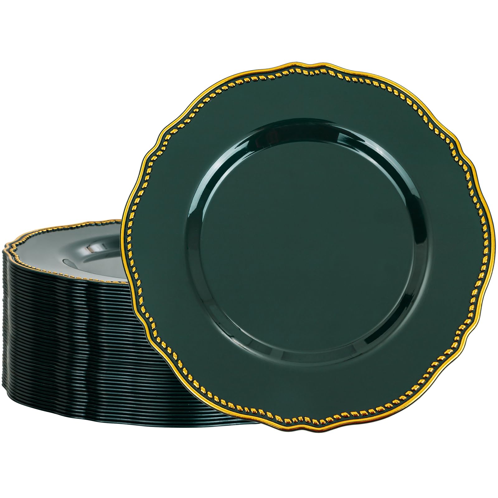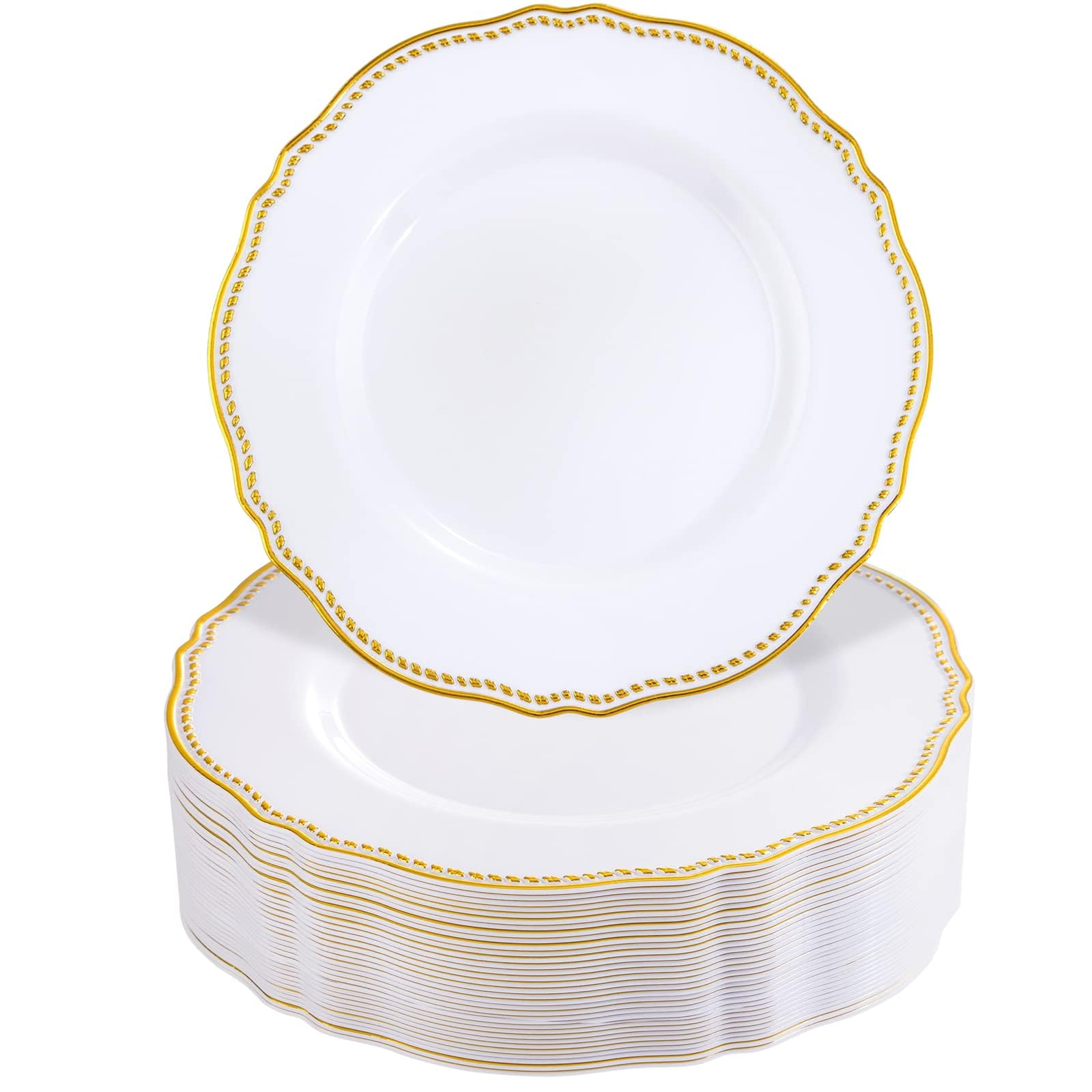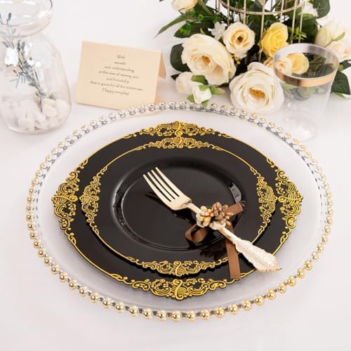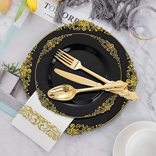 - Exquisite Design - These black disposable plates have a elegant vintage design and handled by strictly quality control,makes the plastic plates are much stronger that regular ones.The gold plastic plates are matching fancy tableware together cups and napkins,in order to make your guest get satisfied.