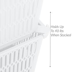 Dimensions: 11"x 9"x 4.75" Patented Slide 2 Stack Design: The corners of each storage tote are designed with slide out support to allow totes to be stackable. This helps to maximize your storage space. Nestable: The totes nest easily inside each other when not in use for easy storage and will take up less space. Holds 40lbs: These baskets are strong and durable enough to hold up to 40 pounds when stacked. Multipurpose: These totes are perfect for your bathroom, kitchen, bedroom, and more. You can easily store towels, soaps, lotions in it. Or you can use them to organize your craft room.