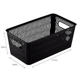 Dimensions: 11.4" x 6.5" x 4.5" Patented Slide 2 Stack Design: The corners of each storage tote are designed with slide out support to allow totes to be stackable. This helps to maximize your storage space. Nestable: The totes nest easily inside each other when not in use for easy storage and will take up less space. Holds 40lbs: These baskets are strong and durable enough to hold up to 40 pounds when stacked. Multipurpose: These totes are perfect for your bathroom, kitchen, bedroom, and more. You can easily store towels, soaps, lotions in it. Or you can use them to organize your craft room.