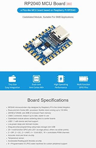 Waveshare RP2040-Zero High-Performance Pico-Like MCU Board Based On Raspberry Pi Microcontroller RP2040 Castellated Module Allows Soldering Direct to Carrier Boards-3pcs
