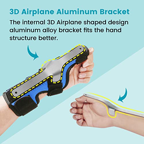 - 【3D Airplane-shaped Aluminum Plate Support Splint】According to the characteristics of thumb bones and tendons, the R&D team designed a bionic airplane-shaped aluminum plate as the bracket for this thumb splint brace, which fits thumb and wrist joints very well. This bracket is made of lightweight and high strength aluminum alloy material, and oxidation process on its surface to make it durable.