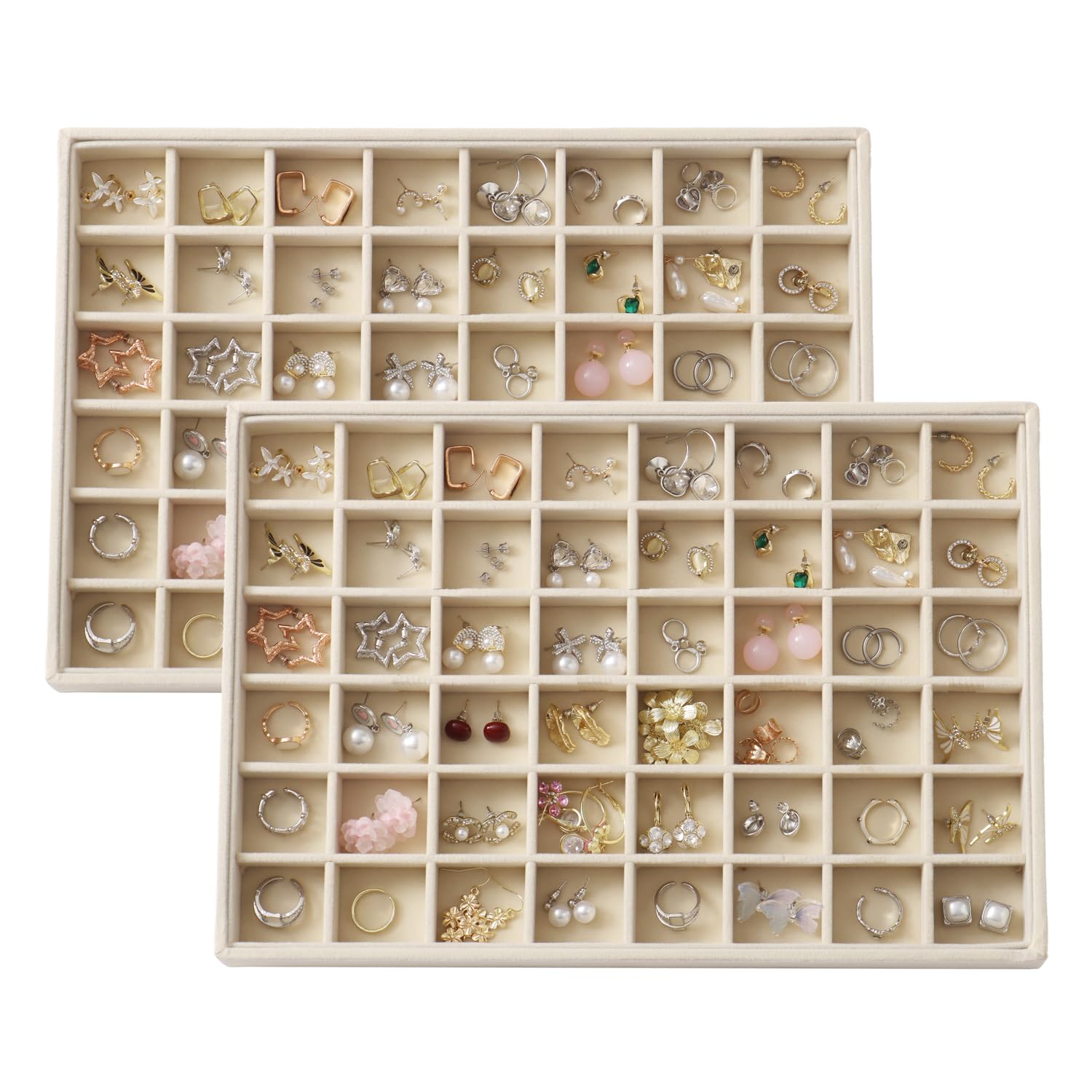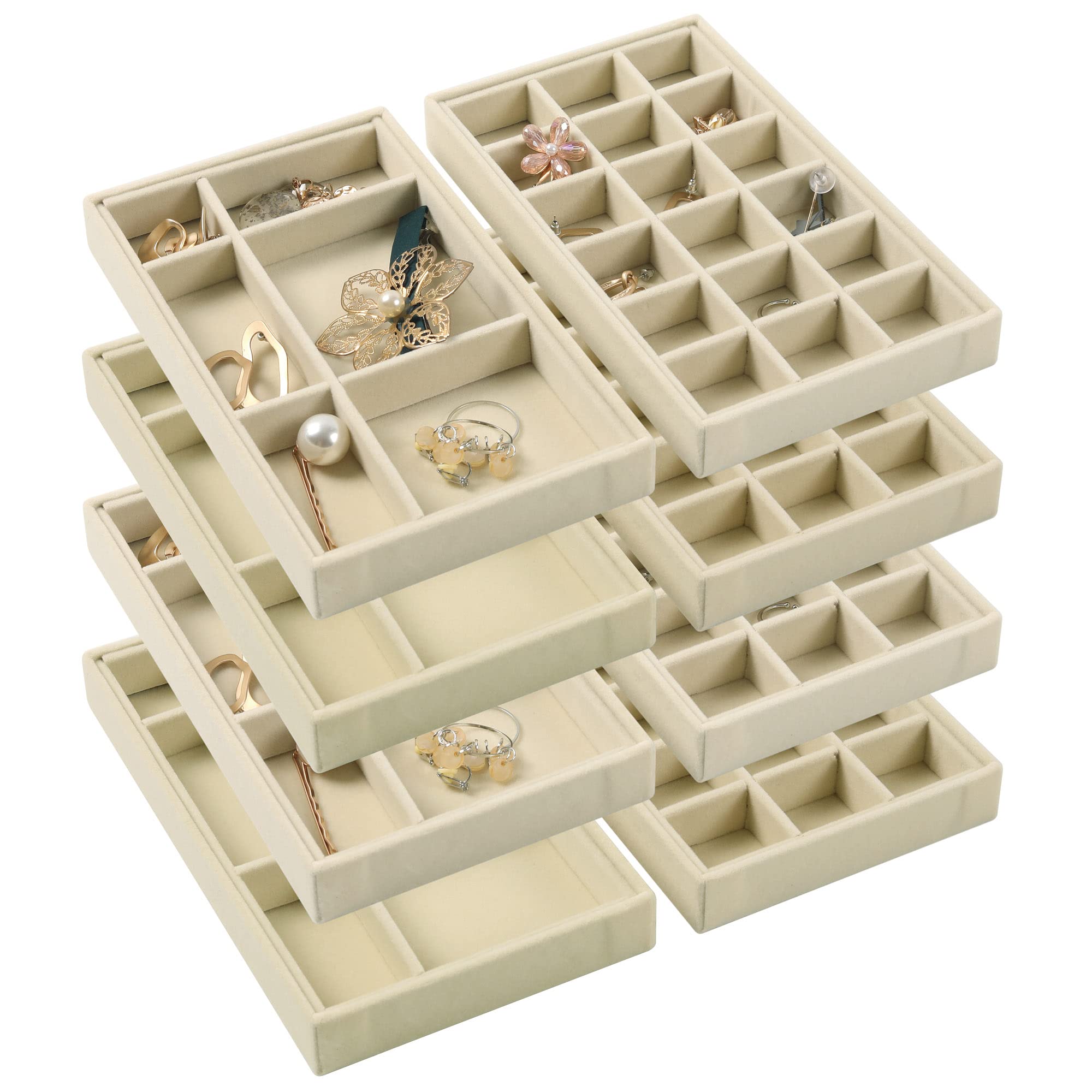 Set of 4: The set includes 30 compartment Tray(1 Pack), 24 compartment Tray(2 Pack), 12 compartment Tray(1 Pack). Color: black outside and beige inside. Suitable for earrings, rings, bracelets, necklaces. Measure: Each tray measures 13.78" x 9.45" x 1.18" inch (LxWxH) and is ideal for storing and displaying your jewelry at home or in the store. You can removed the divider. Material: Made of velvet and composite boards, the organizer trays are soft to the touch and elegant in appearance, protecting your jewelry from any kind of damage. Stylish stackable design: Easy to stack and separate, easy to place in a dresser or drawer. To match everywhere like living room, dressing table, store and makeup table. Easy to organize and display your valuable and important jewelry visibly. Versatility: The jewelry display tray is fit for personal use at home, and suitable for a countertop jewelry display in stores or trade shows. They can also be used to store sewing supplies, home accessories, etc.