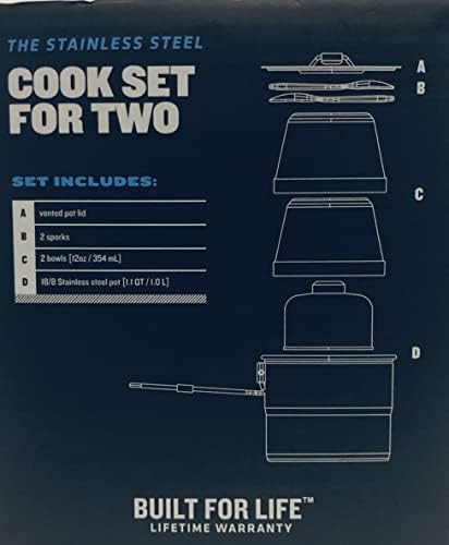 Enjoy delicious hot food straight from the campfire or camp stove. The Stanley stainless steel 6-piece cook set is perfect to cook a tasty meal for two in a 1.0L stainless steel pot. The locking pot handle extends for stable cooking. When it's time to eat, 2 bowls and 2 sporks allow for sharing. It can hold a small canister of fuel and it nests for easy carry-in and carry-out.