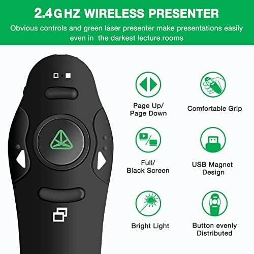 • DISTANCIA DE CONTROL REMOTO INALÁMBRICO DE 50 PIES Y RANGO DE PANTALLA LÁSER DE 300 PIES: Rango de control remoto inalámbrico de hasta 50 pies, para que pueda moverse por la sala e interactuar con su audiencia. El puntero láser verde brillante que es fácil de resaltar áreas clave de sus diapositivas. Puede continuar controlando las diapositivas PPT sin volver al ordenador.