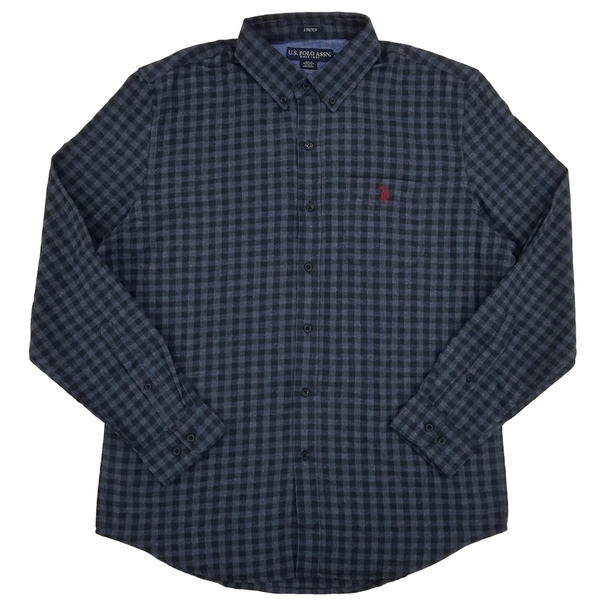 Bring a classic change to your wardrobe by opting for U.S. POLO ASSN. Long Sleeve Classic Fit Yarn-Dye Poplin Heather Woven Shirt. Classic fit. Spread collar. Long sleeves with buttoned cuffs. Buttoned front closure. Curved hemline. Embroidered logo on the chest. Allover plaid pattern. 100% cotton. Machine washable. Imported.