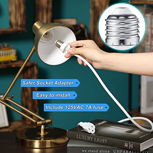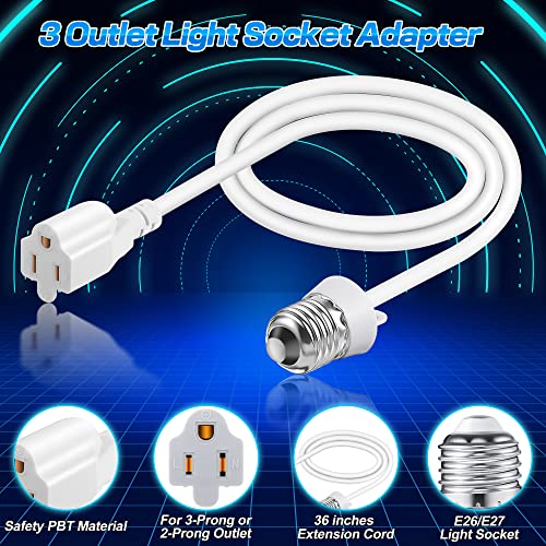 3 Outlet Light Socket Adapter, Convert E26/E27 Bulb Socket to 3 Prong Outlet with Extension Cord, Flexible Light Bulb Plug Converter Suitable for Indoor Outdoor Porch Garage Patio Use(White,1 Pcs)