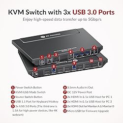 - Enhance your productivity and streamline your workspace with our 2-Port Dual Monitor KVM Switch. This advanced switch allows you to control two PCs using a single set of keyboard, mouse, and two monitors in either extended or mirror mode. Whether you're working, gaming, or learning, enjoy the convenience of managing dual screens effortlessly. With the added flexibility of "USB Mode," you can also display two different video sources simultaneously. Featuring a built-in USB 3.0 hub, it supports high-speed data transfer for up to three peripherals. Experience stunning visuals with support for 4K UHD and high refresh rates. Switching between computers is smooth and quick with front button control and keyboard hotkeys, making it perfect for any demanding setup.