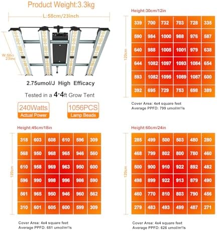 - 【Lámpara de Área de Cobertura Máxima de Espectro Completo】240W Espectro completo (380-410 nm, 660-665nm, 730nm, 3200-4200K, 4800-5000K) es perfecto para el crecimiento de vegetales, 4 barras de luces de crecimiento LED con 1056 diodos LED, proporciona una intensidad de luz distribuida uniformemente. Puede cubrir hasta 4x4 pies para un crecimiento completo de alto rendimiento.