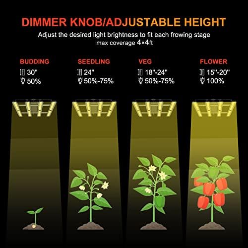 - 【Disipación de Calor Eficiente y Sin Ruido】Nuestras lámparas de crecimiento están hechas de 4 barras de aluminio ligeras, que tienen funciones eficientes de disipación de calor y enfriamiento. Su potente capacidad de disipación de calor no necesita comprar más dispositivos de enfriamiento. Esta luz de planta LED no tiene ventilador, no habrá ruido. Es muy ligera y tiene protección IP67 contra el agua, por lo que es fácil de transportar e instalar