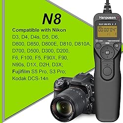 [Automatic Operation] This intervalometer supports time lapse shooting (0s-99hrs 59min 59s, in 1-sec. increments), long exposure time (0s-99hrs 59min 59s, in 1-sec. increments), Interval (1s-99hrs 59min 59s, in 1-sec. increments) and Number of Shots setting (1 to 399, unlimited when set to “--”) [Manual Release] This remote shutter release timer allows you to control the camera autofocus by half-press and release the shutter by full-press without touching your camera to prevent shake [Easy to Set by Selector Button] You can press the left and right button to select different mode and press the up and down button to change the value [Clear All Timer Settings Instantly] You can reset the intervalometer by pressing the “TIMER STRAT/STOP” button and “illuminator/lock” button at the same time. This makes you no need to modify each mode inconveniently [Compatible Models] Compatible with Nikon D3, D4, D4s, D5, D6, D800, D850, D800E, D810, D810A, D700, D500, D300, D200, F6, F100, F5, F90X, F90, N90s, D1X, D2H, D3X; Fujifilm S5 Pro, S3 Pro; DCS-14n