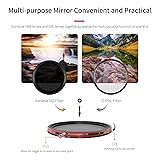 - VND Effect: The Haida PROII CPL-VND 2 in 1 Filter is a variable neutral density filter that provides an exposure reduction of 3 to 7 stops. The 0.9 to 2.1 density creates a darkening of the entire image, allowing you to photograph with a wider aperture or slower shutter speed than normally required. For easier, repeatable control over density settings, the front ring is also visually demarcated with dots that represent different density values and includes a rotation lever to further enable fast, as well as precise positioning of the front ring. Coating : This PROII CPL-VND 2 in 1 Filter is constructed from optical glass for clarity as well as color fidelity. To prevent internal ghosting and reflections, the glass features eight layers of multi-coating. These coatings also offer greater protection to a filter substrate and help it to stay clean for longer than with uncoated filters. Frame:Ultra slim aluminum alloy ring ensures durability while allowing the filter to remain lightweight. The thin, aluminum-alloy filter ring minimizes the potential for vignetting, while remaining durable and lightweight.