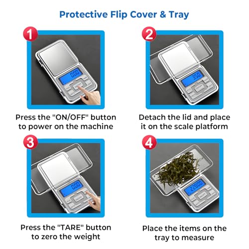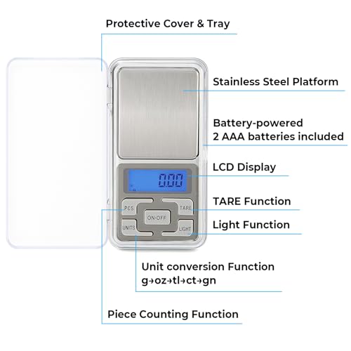 - High-Quality Features: Compact pocket scale built with stainless steel platform for durability, flip cover tray for easy weighing and protection, backlit LCD display for clear readings, and powered by 2 AAA batteries (included) for your convenience.