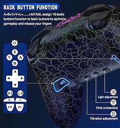 【Unique Cracked Design & Custom Lighting Effects】Your switch controller will have 9 different colors of adjustable LED lights, so you can switch your favorite color whenever you want; red like hot "lava", blue like Godzilla's atomic pulse or a brilliant bolt of lightning! If you like a bright light in the dark as much as I do, buy it now! You'll be the coolest of your friends 【Easier Pairing And Wake-Up Function】After entering the console connection interface, simply press and hold the SYNC button of the switch pro controller to connect until the signal light flashes to complete the first connection. Next time, just press the "HOME" button to wake up your console(NOTE: DOES NOT SUPPORT WAKE-UP SWITCH 2 AND AUDIO FUNCTIONS) 【Compatible With Switch Console/Ios/Android/PC】Upgraded switch controllers not only compatible with Switch Console, and also is available for iOS/Android/PC. Gaming controllersupports wireless connection to play switch games, iOS MFI games(IOS 13.0 and above), Android HID games; Can also be connected to a PC via the included Bluetooth receiver for wireless Bluetooth connection, supports playing X-Input and Steam games (Windows 7 and above) 【Programming Function Of Switch Controller】The wireless switch controller has 2 back buttons "M1/M2", these two function buttons can be programmed as 1-16 basic buttons. When programming the buttons, the pro controller will record the time interval we press each button, we can assign a set of combo skills to these two buttons. Then release the combo skills with one button to defeat the boss easily and make the game operation more smooth 【Adjustable Light Mode】The wireless switch controller has 9 LED light colors to choose from: 8 colors and rainbow LED colors that can be easily switched by simply pressing the light button on the back; if the lights that are always on make you tired, you can choose to adjust the lights to breathing light mode, flashing light mode or turn off some/all of the lights. In addition, you can also adjust the light brightness, if the user is a child, you can adjust the light to the lowest level 【1000mah Battery Capacity】In order to meet the demand of game time for game fanatics, we increased the battery capacity of the switch controller to 1000mah! The package includes a UBS-C charging cable, charging for 3 hours can last about 12-16 hours, so you can enjoy playing all day even with the lights effect is fully on 【Adjustable Turbo & Vibration Function】Wireless Switch Pro Controller can be set to auto TURBO or manual TURBO mode. You can set TURBO to A/B/X/Y/L/ZL/R/ZR keys. There are 3 adjustable speed: 5shots/s, 12 shots/s or 20 shots/s. What’s more, switch turbo controller also have dual vibration motors with 4-level precise vibration: None, Weak, Medium and Strong that provide you excellent vibration feedback to enhance the game immersion 【Ergonomic Design & High Perfomance Buttons】The switch pro controller’s ergonomic design practically makes it melt into your hand. And the cracked design has a non-slip effect that allows you to control the game stably and don’t have to worry about the sweat in your hands. All buttons of the wireless switch controller are clicky without feeling cheap and the triggers have the perfect amount of travel; short and sweet without feeling restrictive 【After-sales & Support】If you have any questions or suggestions about our pro switch controller during the process of using them, please tell us! And our Gammeefy professional customer service team will get back to you within 12 hours and provide you with support