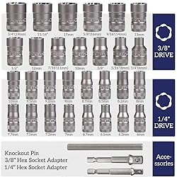 Efficient Removal: Thinkpro bolt extractor set covers the most commonly used and requested standard (SAE) and metric (mm) sizes, allowing you to easily extract nuts, bolts & screws that are rusted, worn, painted over, or even completely stripped or broken. Designed for Tight Space: Our nut extractor socket set has a longer and slimmer profile. This particular design of extractor is well-suited to tight access, compensating for the shortcomings of traditional hex extractors. Superior gripping power: The internal thread of thinkpro upgrade bolt extractor with reverse spiral flutes has a good grip on the bolt, providing excellent torque; the more you turn, the tighter the socket grips. Convenient to use: Our bolt extractor comes with standard 1/4" and 3/8" square head and hex adapters, allowing you to use your preferred hand, air, or power tool. It also comes with a knock-out pin for easy removal. Trustworthy quality: Each strip bolt remover socket set is manufactured from high-hardness CR-MO steel for superior durability and lifespan and is stored in a heavy-duty case with clear laser-etched dimensions for easy carrying and identification.