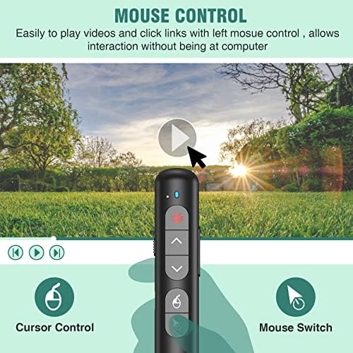 - 【Bright Red Light & Long Control Range】 Wireless presenter is with a bright red light which is easy to see against most backgrounds; Control Range is long enough to meet your needs: Wireless mouse function range: ≤50 FT; RF 2.4 Ghz range: 100-165 FT; Red light range: ≤328 FT