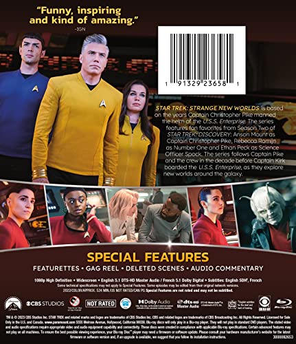 Derivado de la segunda temporada de "Star Trek Discovery", y ambientado en el mismo período que precede a la serie original, este aclamado esfuerzo sigue al capitán Christopher Pike (Anson Mount) mientras dirige los viajes de la U.S.S. Enterprise con la ayuda del oficial científico Spock (Ethan Peck), la enfermera Christine Chapel (Jess Bush), la cadete Nyota Uhura (Celia Rose Gooding) y la primera oficial Una Chin-Riley (Rebecca Romijn), también conocida como Número Uno. Christina Chong, Melissa Navia, Babs Olusanmokun y Bruce Horak también protagonizan. 10 episodios en 3 discos. 8 2/3 horas. Pantalla ancha; Banda sonora: Inglés.