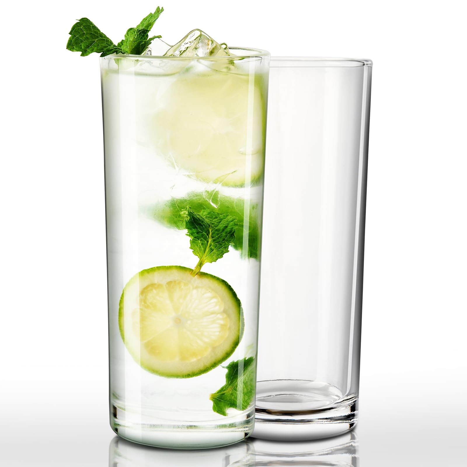 - [All-PURPOSE GLASSWARE]-They feature with a full capacity of 16 fluid ounces are an excellent size for Gin,Tonic,juice,mojito,coffee,mixed drinks,iced tea,cocktail,juice,soda,smoothies and so much more,these classic clear highball glasses match with any table setting,at the same time,they are great for home bar collection.