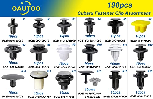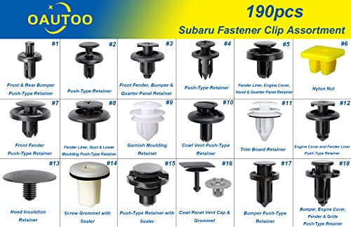 OAUTOO 190pcs for Subaru Body Interior and Exterior Retainer Fastener Clip Assortment 19 Most Popular Sizes & Applications