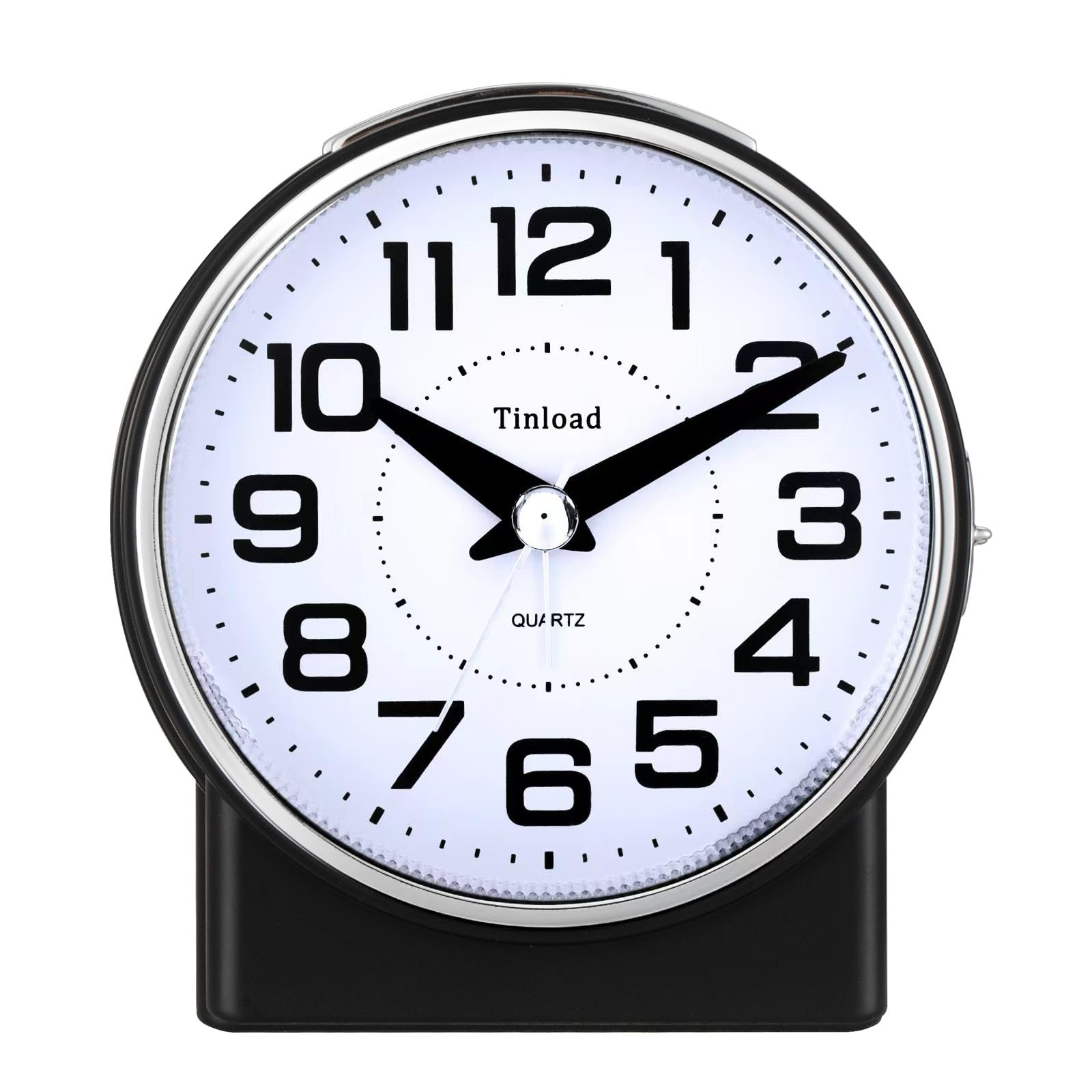 EASIBEST Silent No Ticking Analog Alarm Clock for Senoirs Vision Impaired Big Size4.72 x 3.66 x 2.55 inch with large black numbers on white clock face can be seen easily from a distance,it stands at a small angle which help you see the time more comfortable,great for kids old people those with poor vision Noiseless Tick the second hand moves quietly which doesnt disturb your sleep if put at bedside or draw your attention from what you are focused on doing things Easy to Operateturn the two knobs at the back to adjust the time and alarm,toggle the side located alarm switch to turn on/off the alarm,great for people who want a simple clock without complicated buttons Crescendo Alarmit goes off at a low voice and then get louder gradually to wake you up naturally not scare you out of bed,better for your sleep health Led Lightpress the long wide light button on top to illuminate the dial entirely in dark,very clear to see the time at night Snooze Functionwant more sleep when the alarm goes off? Just press big snooze button on top to get extra 5 minutes sleep and you can snooze many times within one hour Battery Operated for Portabilityit runs on two AA battery(not included)which is advised to use carbon zinc battery better for quartz movement life,no cables around is ease for your table and easy to take it away as travel clock Beautiful Lookit is not only an alarm clock but also a pretty decoration for your home office,place it in kitchen,bathroom,bedroom,living room,bookshelf,fireplace mantel coffee table windowsill,TV cabinet anywhere you like to beautify your space Great Gift Cock give it as a present to your mom dad grandpa grandmom friends also great for kids to learn how to tell the time Package include 1 x clock 1 x instruction manual