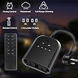 Remote Control & Range: The dimmer switch comes with a remote control, you can confidently control outlets around your home up to 100 Ft. Multiple Timer Functions: Choose the schedule you want(2, 4, 6 or 8 hours),Let our dimmer timer do the work for you. Convenient and energy saving. Two Outlets In One Equipped with 2 grounded outlets, twice the fun. You can dim together at the same time.(It is not suitable for the low voltage string light such as 12V) Brightness Adjustment: It has 4-types of Fixed dimming (25%/50%/75%/100%) and 10-100% dimming function,You can adjust the brightness you want to match your actual scene for different periods of time. Water and dust proof design: Safely place in areas that are exposed to rain, dust. It is not recommended to use in open Spaces during rainy days to avoid the risk of electric shock.It suitable for Patio /String lights/ Lamp. Worry-free purchase: If you have any questions about the product, please email us through Amazon and you will get the best solution right away.