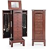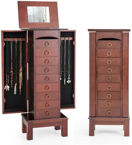 COSTWAY Standing Jewelry Cabinet, Wooden Jewelry Storage Chest with 9 Drawers, 2 Side Doors & Flip Top Mirror, Bedroom Jewelry Armoire with Top Divided Compartments