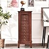 Description Are you tired of organizing your messy jewelry? Our jewelry cabinet will be your good helper. It has 9 drawers, 8 hooks in 2 doors and top storage compartments to organize your earrings, accessories, cosmetics, necklaces, rings, bracelets and watches. Besides, it’s also designed with an embedded mirror to try on your jewelry. To better protect your jewelry, we equip it with soft lining to avoid scratches. Stable wood legs and anti-toppling device keep it durable and sturdy. High feet design helps you to conveniently clean the floor area. In addition, simple structure and easy-to-understand instruction ensure easy assembly. Feature Multiple storage space: 9 drawers, 8 hooks and 1 top compartment Thickened MDF and solid wood legs with anti-toppling device for durability 2 side doors can be closed to prevent dust and save space Perfect for dressing room, bedroom, cloak room Convenient metro ring for easy open and close the drawer Flip top mirror for you to try on your jewelry Build-in soft lining prevents jewelry from scratching Easy to assemble and clean with clear user manual Specification Color: Walnut Material: MDF+ Glass Dimensions: 15.5” x 10.5” x 40”(L x W x H) Package Includes: 1 x Jewelry Cabinet 1 x Instruction