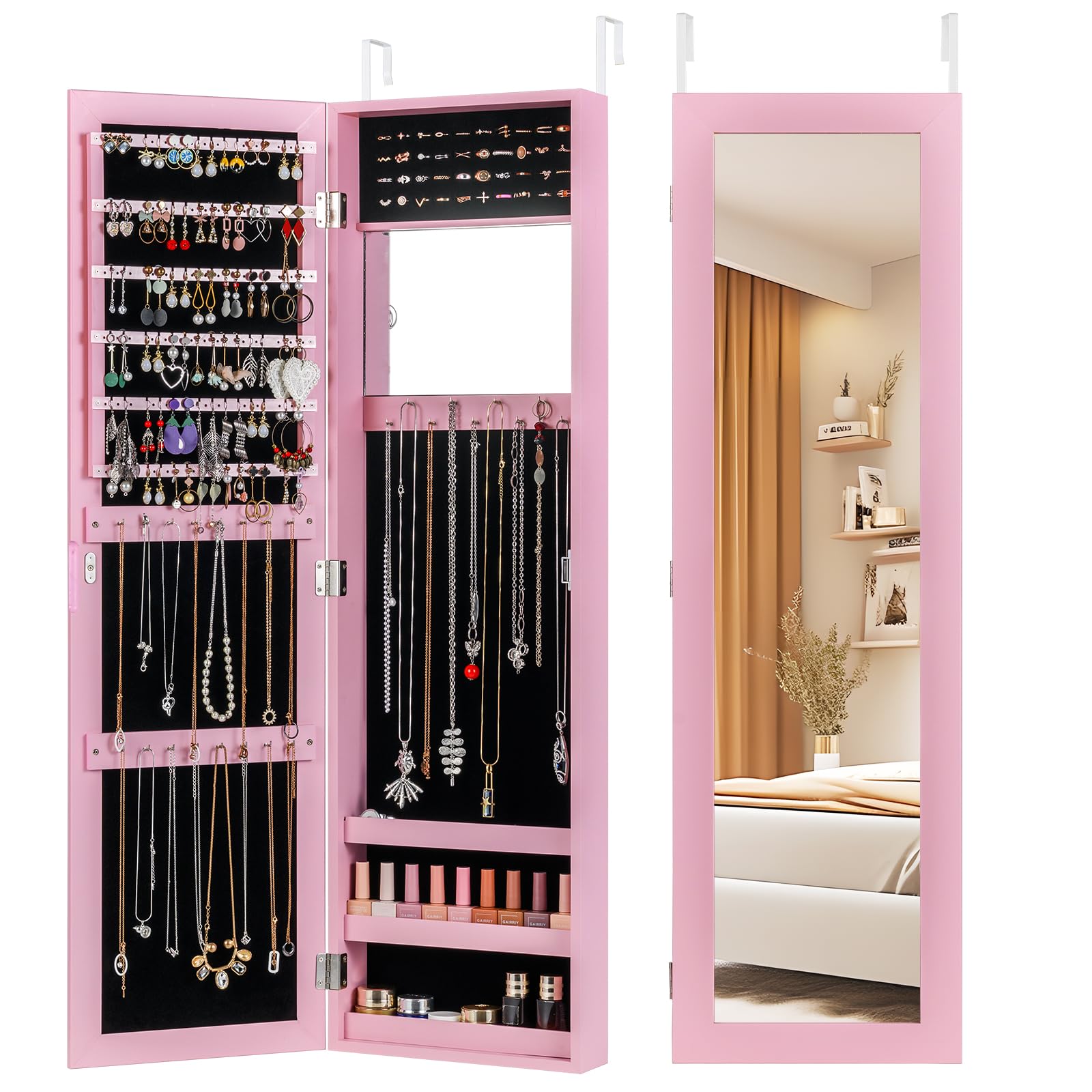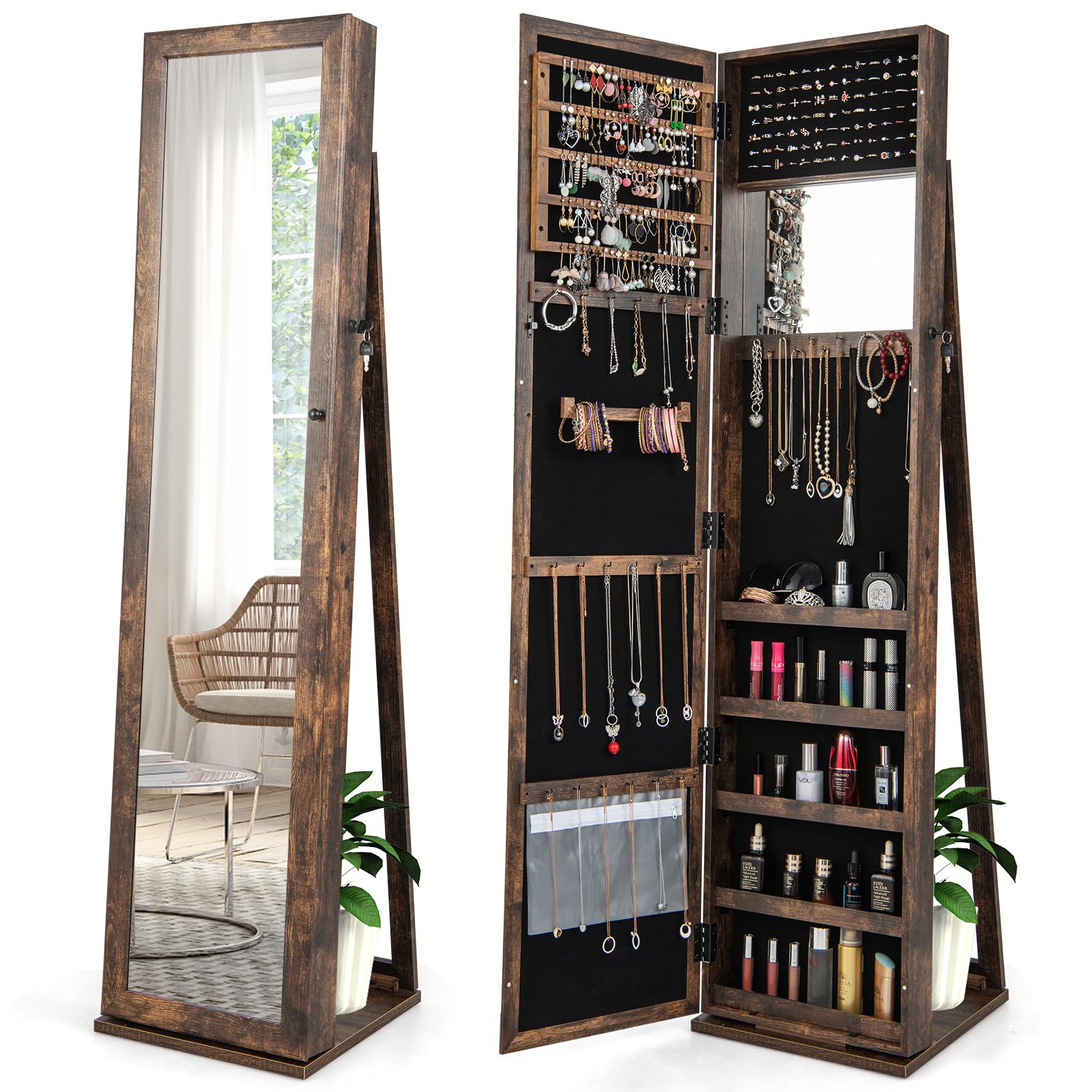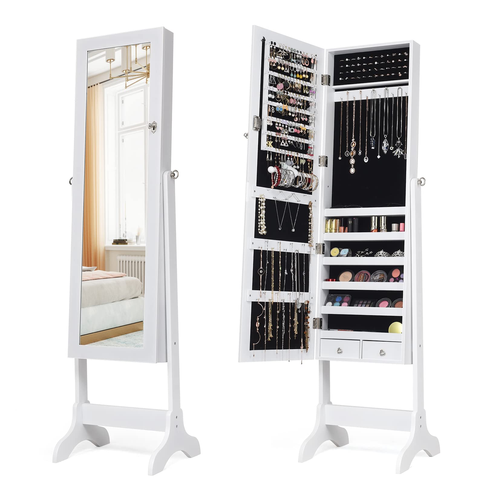 - [Flip Top Mirror & Divided Compartments]On the top of the jewelry cabinet is a divided compartments, which helps you organize your rings and bracelets. And flipping the top layer, you will get a makeup mirror, which makes convenience for you to check your look when wearing your jewelry.