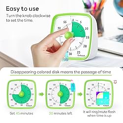 Time Management Tool: The 60-minute visual timer assists in improving concentration and activity productivity. You can finish tasks efficiently. Farewell to procrastination and developing a sense of time Easy Timer: Twist the setting knob clockwise to set the countdown time you need and concentrate on your task and wait for the colored disk disappearing Visual Timer Kids and Adults: It is an awesome visual timer for toddlers, kids, adults, and seniors. The visible timer is also friendly for ADHD or autism because of its simple operability and readability No Ticking Sound: The Pomodoro timer runs silently. Make you concentrate on your task Optional Audible Alert: You don't need to worry that the ticking noise makes you disturbed. The visual timer has 3 alarm modes: mute flash, low, and loud. You can choose the various alarm modes on different occasions Wide Applications: This countdown timer can be applied on different occasions. Such as you use at home, in the kitchen, at school, in the classroom, and at work. It will be a nice kitchen timer, classroom timer, work timer and study timer
