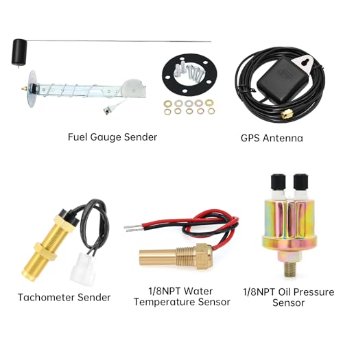 - 【Package Included 】: Package Includes GPS Antenna, Tachometer Sensor(M16*1.5), Water Temp Sensor (1/8 NPT), Oil Pressure Sensor (1/8 NPT), 240-33 ohms Fuel Level Sender & Installation Instructions