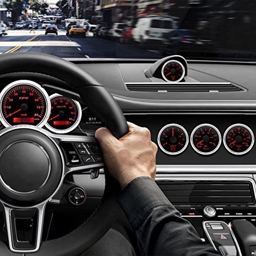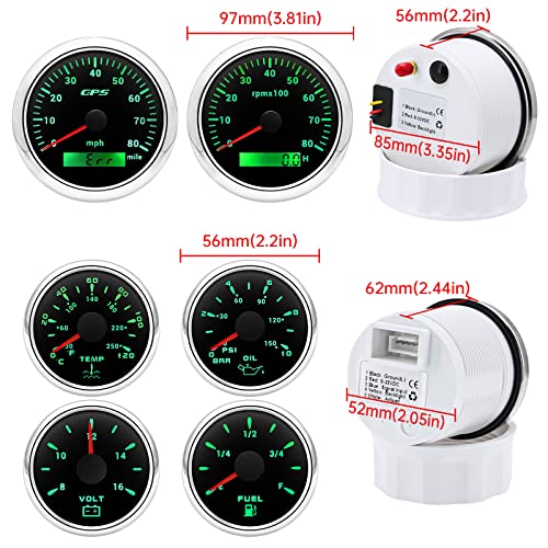 - [ Boat Gauges Set]: GPS Speedometer gauge indicating Range: 0 - 80 MPH, Tachometer indicating Range: 0 - 8000 RPM, Volt gauge indicating Range: 8 - 16V, Fuel Level gauge indicating Range: E - F & Resistance 240-33 ohms, Water Temperature gauge indicating Range: 30 - 250°F (0 - 120°C), Oil Pressure gauge indicating Range: 0 - 150 PSI (0 -10 BAR)