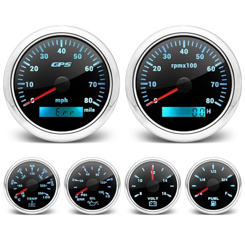 ARTILAURA 6 Gauge Set-GPS Speedometer, Tachometer, Fuel Level, Water Temperature, Oil Pressure, Voltage 7 Color Backlight Boat Gauges Set Marine Car (Black)