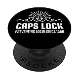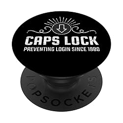 CAPS LOCK PREVENTING LOGIN SINCE 1980 for a computer geek, IT administrator or computer engineer Computer joke gift for developers and coders who love coding, programming and software engineering PopGrip with swappable top; switch out your PopTop for another design or remove it completely for wireless charging capabilities. (Not compatible with Apple MagSafe wireless charger or MagSafe wallet.) Expandable stand to watch videos, take group photos, FaceTime, and Skype handsfree. Advanced adhesive allows you to remove and reposition on most devices and cases. Note: Will not stick to some silicone, waterproof, or highly textured cases. Works best with smooth, hard plastic cases. Will adhere to iPhone 11, but not to the iPhone 11 Pro nor the iPhone 11 ProMax without a suitable case.