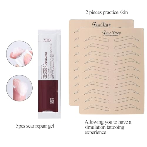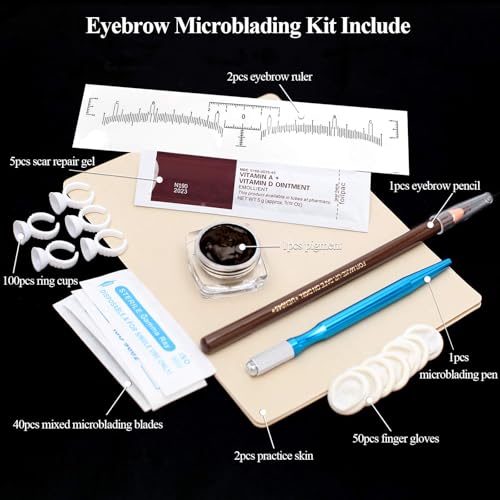 - Practice Kit: This brow kit include 1pcs pigment, 100pcs ring cups, 50pcs finger gloves, 40pcs mixed blades, 1pcs pen, 2pcs eyebrow ruler, 2pcs practice skin, 5pcsrepair gel and 1pcs eyebrow pencil. For professional use and learner practice.