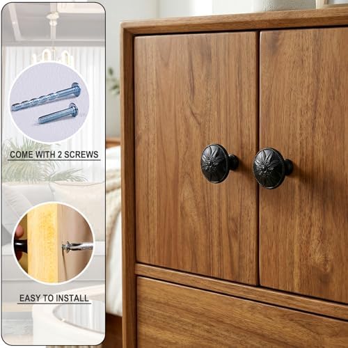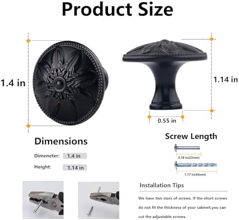 Sophisticated Matte Black Finish & Versatile Style:With a durable matte black electroplated finish, these knobs blend seamlessly into industrial, rustic farmhouse, or antique-style cabinets, drawers, and closet doors, offering understated elegance. Dual-Screw Flexibility for Multi-Scenario Use:Includes 22mm & 45mm M4 screws (break-away design) for cabinets of varying thickness, from black kitchen cabinets to antique black dresser drawers, ensuring hassle-free installation. Robust Zinc Alloy & Anti-Fade Craftsmanship:Crafted from solid zinc alloy with fade-resistant matte black plating, these knobs resist oxidation and fingerprints, ideal for humid bathrooms and busy kitchens. Timeless Upgrade for Rustic & Modern Spaces:Elevate rustic black cabinet pulls, industrial black drawer knobs, or modern kitchen hardware with this timeless matte black knob, designed for versatility in closets, desks, and more.