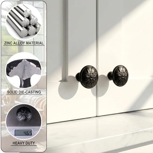 - Matte Black Look & Zinc Alloy : The round cabinet knobs are made of 100% high quality solid zinc alloy die-casting and black with a nice matte color to the flower. elegant and durable, it has strong corrosion resistance, wear resistance, no fading and no rust.