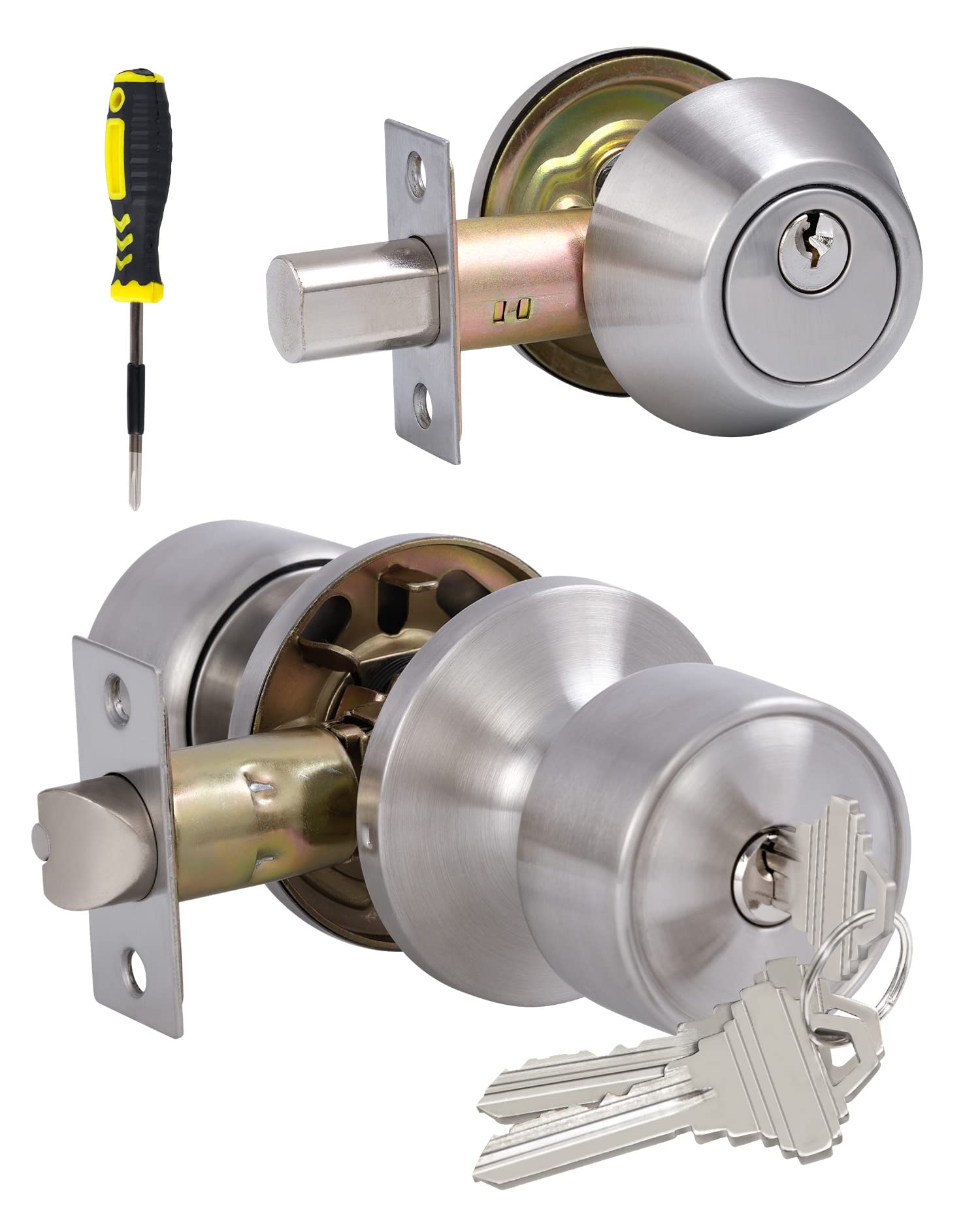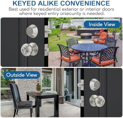 - [PRODUCT FEATURES] All Keyed alike entry door knob and deadbolt set(all locks can be opened with one key), single cylinder deadbolt(keyed outside and turn button inside); Made from solid stainless steel; Door knobs set in Satin Nickel