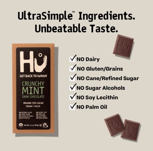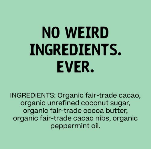 CRUNCHY MINT CHOCOLATE: Our most refreshing bar. Made with peppermint oil for a subtle mint flavor. Satisfying crunch provided by specially-sourced organic fair-trade cacao nibs throughout. Ingredient lists have never been so simple: Organic fair-trade cacao, unrefined organic coconut sugar, organic fair-trade cocoa butter, organic fair-trade cacao nibs, alcohol-free peppermint oil.