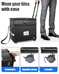 Double layered non-itchy silicone coated fiberglass Fireproof rolling file box features 4 omni-directional wheels for easy transport between home & office; Detachable wheels with brakes to anchor box securely 3-layer non-itchy silicone resin-coated fiberglass construction withstands temperatures up to 2200°F; Waterproof protection for documents in event of flood or humid weather Spacious 26-pocket interior with 15.75" x 12.6" x 15" dimensions stores letters, legal docs, CDs, USBs, photos, passports, tablets & more Easy to assemble, foldable when not in use to save space; Reflective stripe for visibility at night; Password lock provides security for contracts, cards, certificates Upgraded model with double zipper design for convenient access; Includes instruction manual for combination lock to secure each compartment