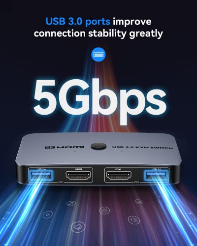 - 【Package and Warranty】Our kvm switches comes with 2 pack 100cm(3.28ft) hdmi cable and 2 pack 120cm(3.94ft)usb 3.0 cables,1 usb c charing cable,no need to spend extra money on cables.What You Get: 1*KVM Switch, 2*HDMI cable, 2*USB 3.0 Cable, 1*User manual,If any issue,please contact us to solve,we provide 12-month warranty and 24h professional customer service and technical support.