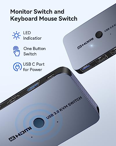 - 【USB KVM HDMI Switch Box】This HDMI KVM Switch allows you to control 2 computers with only one set of USB devices (Monitor, Mouse, Keyboard and Printer). You can easily switch between two displays with one button-pressing,it is not only a monitor switch but also a keyboard mouse switch.