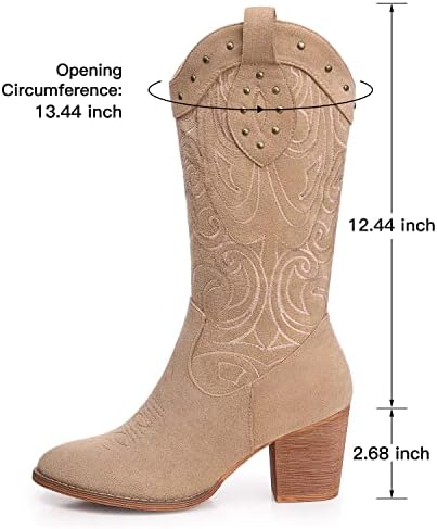 SHIBEVER Cowboy Cowgirl Boots for Women: Wide Calf Western Pointed Toe Chunky Heel Suede Embroidered Mid Calf Boot